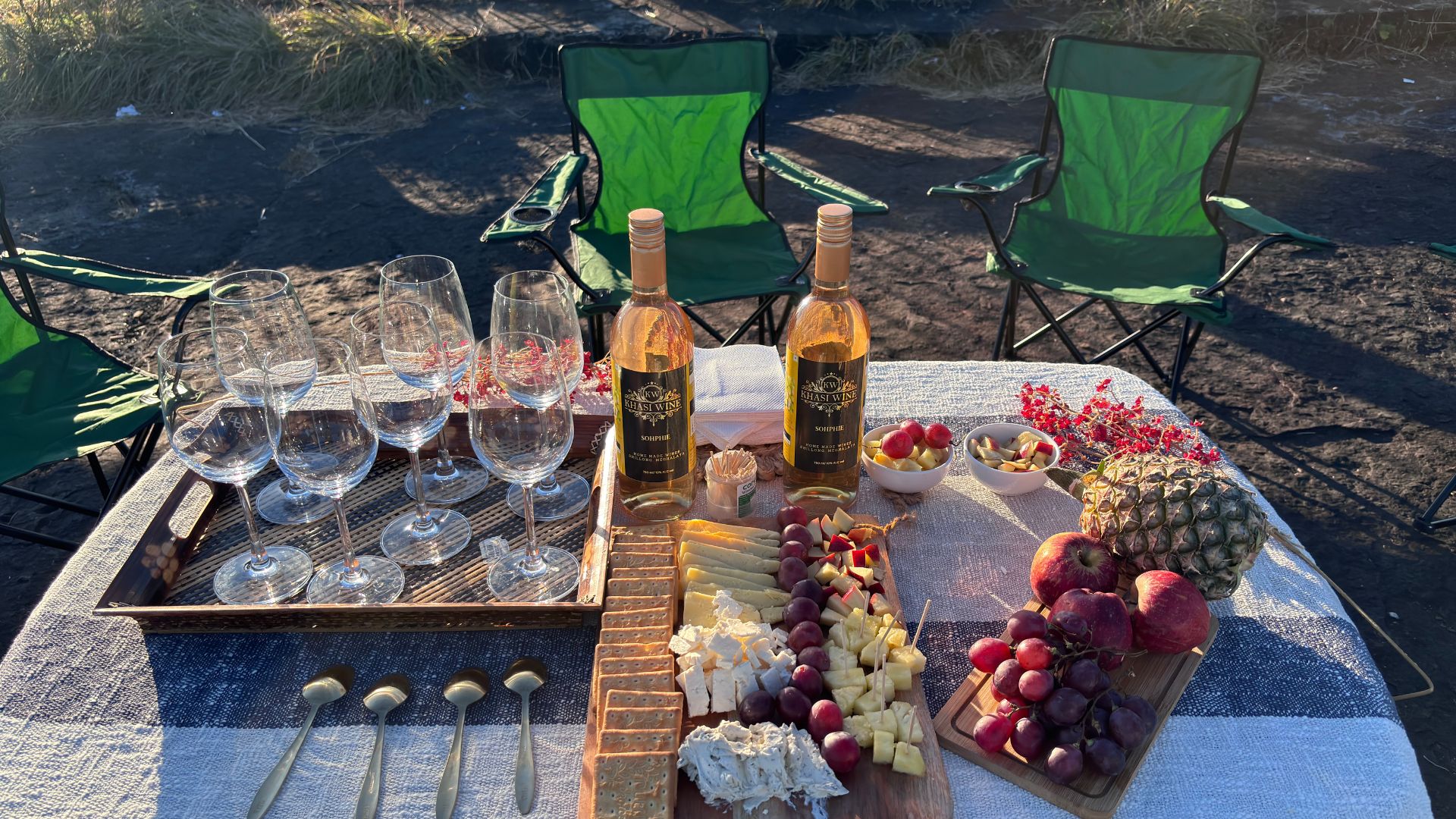 Set in an exquisite outdoor set-up, this tasting experience celebrates the land and its gifts. Sample local fruit wines made from Sohphi (Raspberry wine), passionfruit, ginger, and other endemic products. Each wine carries the essence of Meghalaya’s wilderness, the sweet-tart bite of forest fruits, the warmth of hillside spices, and the freshness of the cool, mist-kissed climate. These are paired with cheeses sourced from the capital , homemade jams infused with local berries, pure locally produced Meghalayan honey, fragrant spices such as turmeric, black pepper, cinnamon, and bowls of freshly picked fruits and olives.